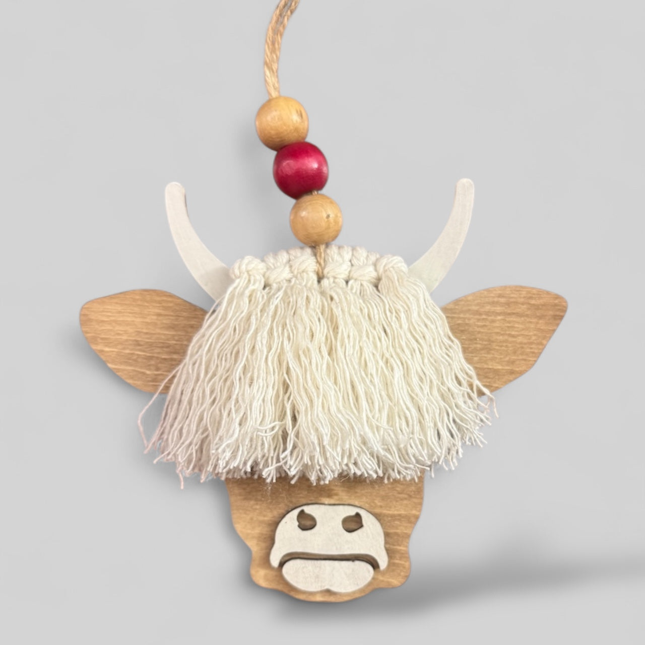 Crafted with love and rustic charm, this adorable macrame highland cow ornament is the perfect addition to your home, car, or holiday tree. Made from natural wood and soft macrame fringe, this unique cow decoration features a charmingly detailed face and beaded hanger. Ideal for farmhouse decor, this handcrafted ornament is a thoughtful gift for any animal lover or fan of rustic aesthetics. Add a touch of cozy, rural style to your space today!
