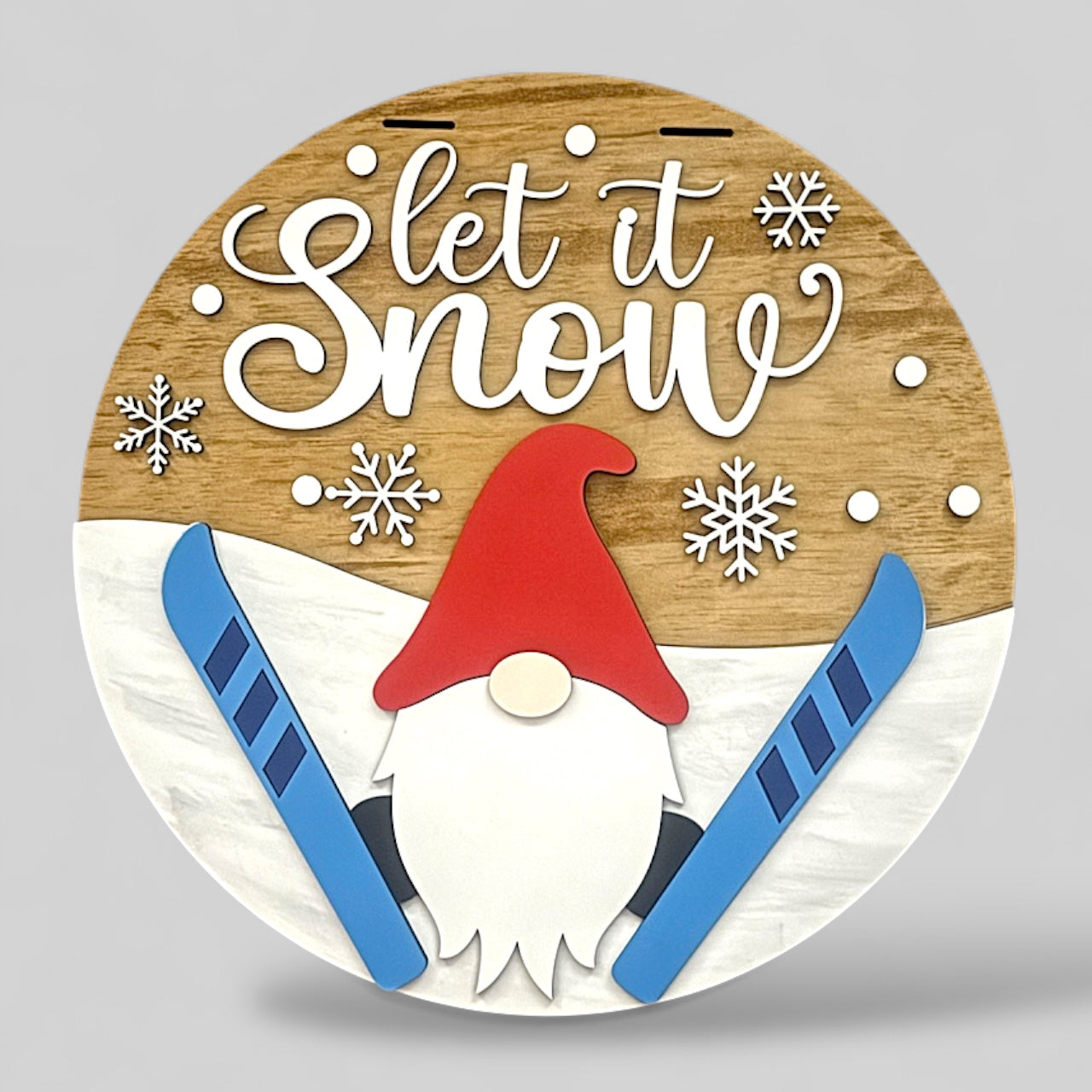 Bring a touch of whimsical winter charm to your home with this adorable "Let It Snow" gnome sign. This multi-layered wood sign features a cheerful gnome sporting a red hat, nestled between a pair of blue skis against a rustic wood-grain backdrop. Perfect for adding a cozy, festive feel to your front door or mantel, it's a delightful piece of holiday decor for any gnome lover or ski enthusiast.